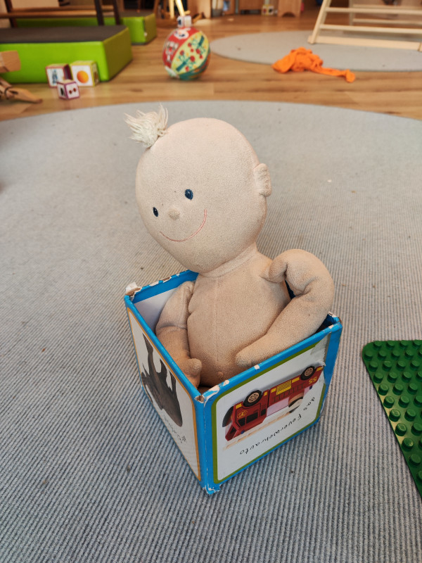 Kuscheltiere und Schnuller geben den Kindern Geborgenheit. Wenn sich die Jalousie schließt, singen wir La Le Lu, das Lied vom Mond. Bei Bedarf bleiben wir einige Zeit bei den Kindern am Bettchen und geben Ihnen die Nähe, die sie brauchen. Eine von uns bleibt im Schlafraum bei den Kindern, nachdem alle Kinder eingeschlafen sind. Die andere macht Klarschiff im Küchenbereich und Spielraum.